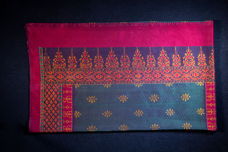 “ผ้าปูมทองพัน” มีสีสันของผ้าที่ยังคงเอกลักษณ์ดั้งเดิมของผ้าทอในจังหวัดสุรินทร์ โดยเน้นสีหม่น เย็นตา ไม่ใช้สีฉูดฉาด และจัดวางลายร่วมกันให้ดูแปลกตา โดยลวดลายต่าง ๆ ที่บรรพบุรุษได้สร้างสรรค์ไว้ล้วนได้รับอิทธิพลมาจากวัฒนธรรมของเขมร ลวดลายล้วนสื่อความหมายถึงความเป็นสิริมงคล